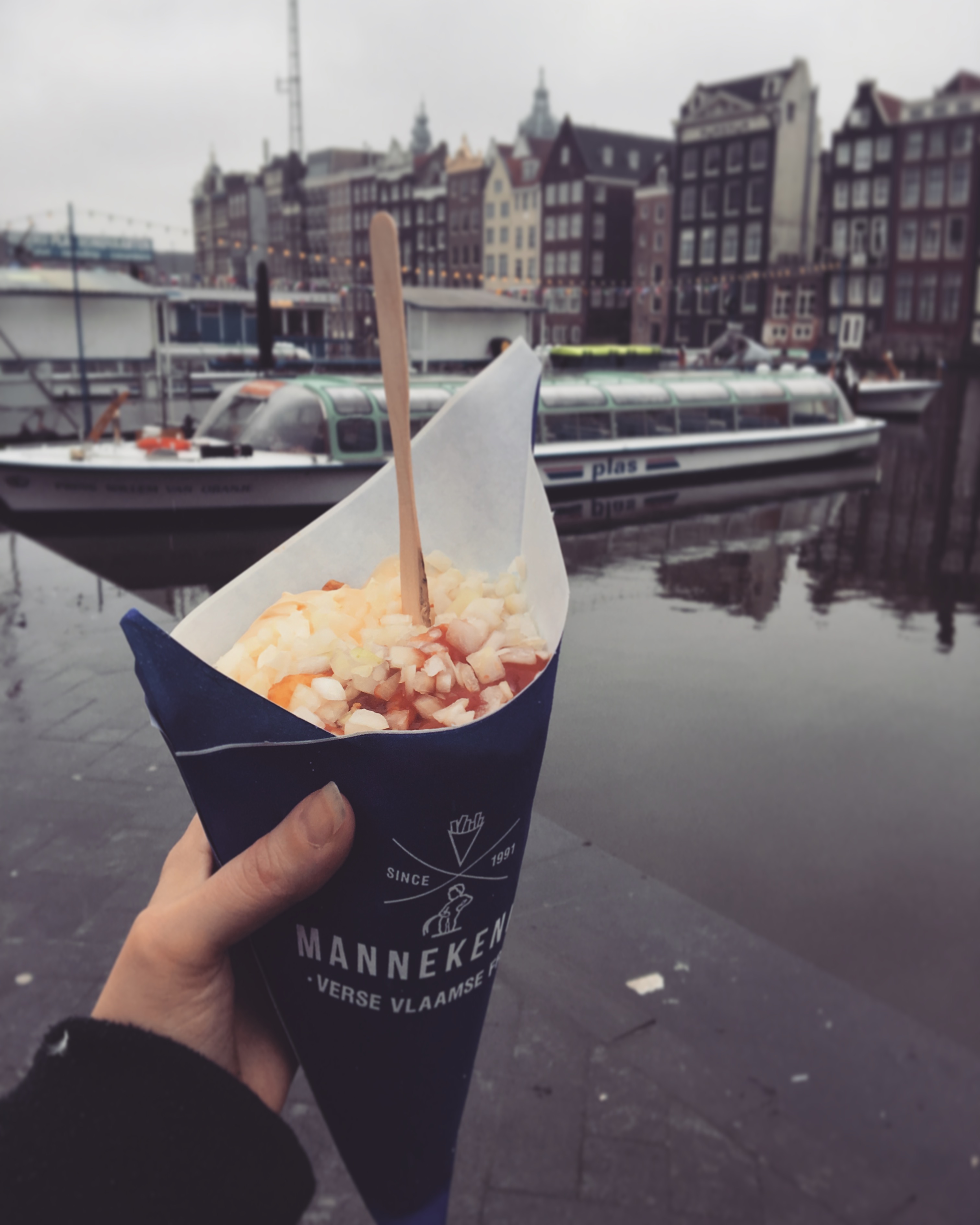 I was so hungry when I left the museum that I walked all the way to the city center to buy myself some patatje speciaal (special fries!): hot & salted friets topped with a specialty combo of ketchup, mayo, and diced raw onions – always served with a mini, wooden fork.